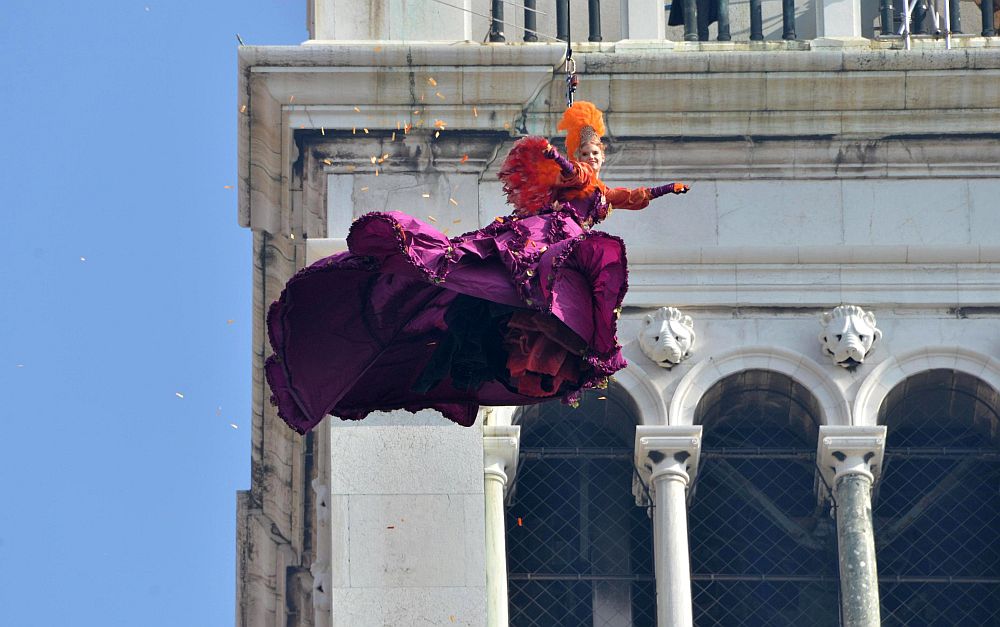 По обед смелата Клаудия Каркиори се спусна грациозно от камбанарията на площад "Сан Марко", завързана с въже, дълго 80 метра, над участниците в карнавала, който е един от най-известните в света.