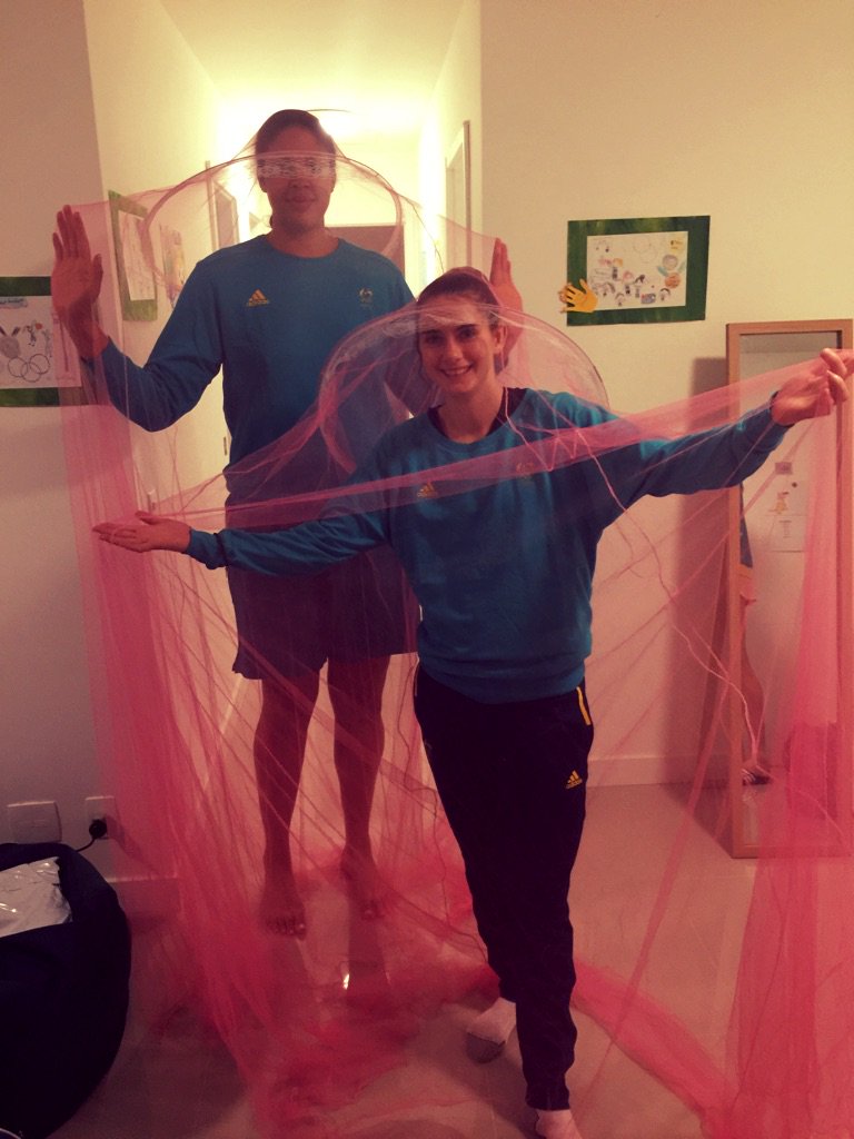 А на тази снимка австралийската баскетболистка Елизабет Камбейдж се пременя в костюм, предназначението на който е да ви предпази от смъртоносния вирус Зика.